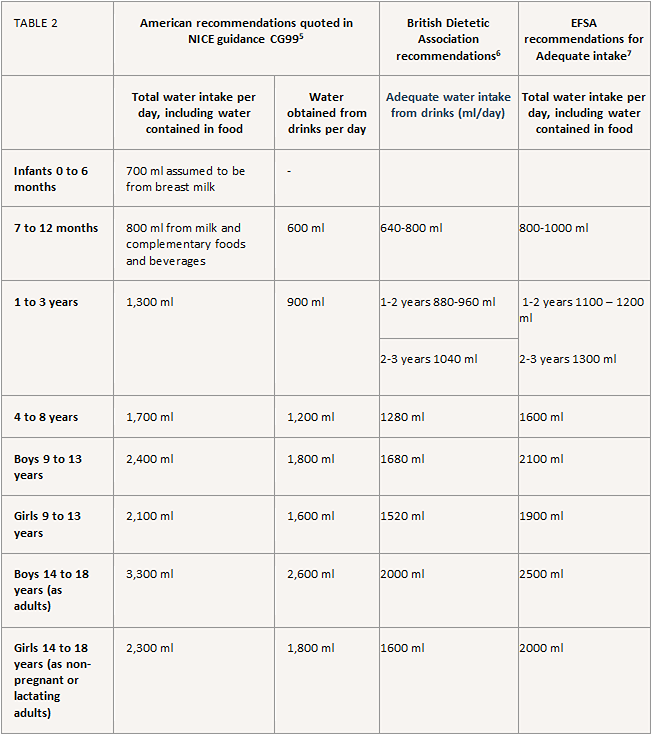 Recommendations vary within the UK. Table 2 below shows different recommendations given to children from organisations within the UK, as well as the EFSA adequate intakes. Notice the American guidance quoted in the NICE constipation guidlines outlining both total water intake from food and drinks, as well as the recommendations from drinks separately.